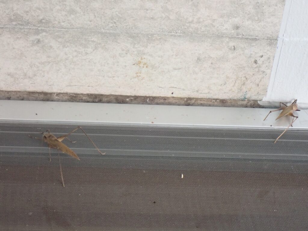 みんみんの研修室のサッシに茶色いタイワンクツワムシが2匹とまっています。