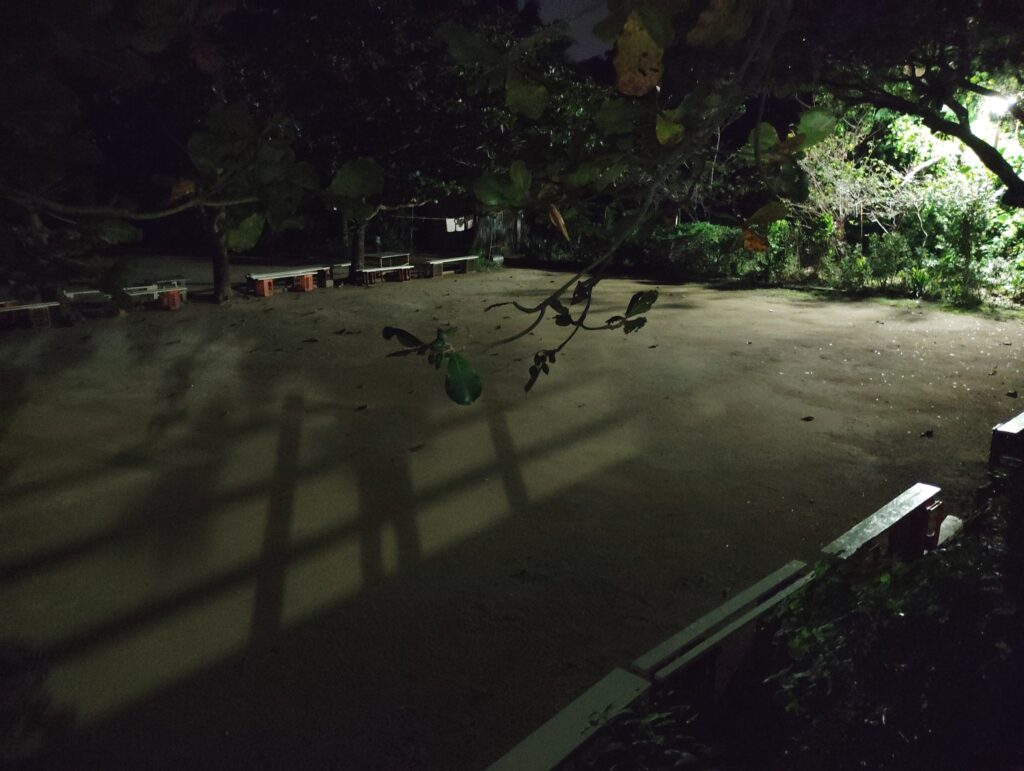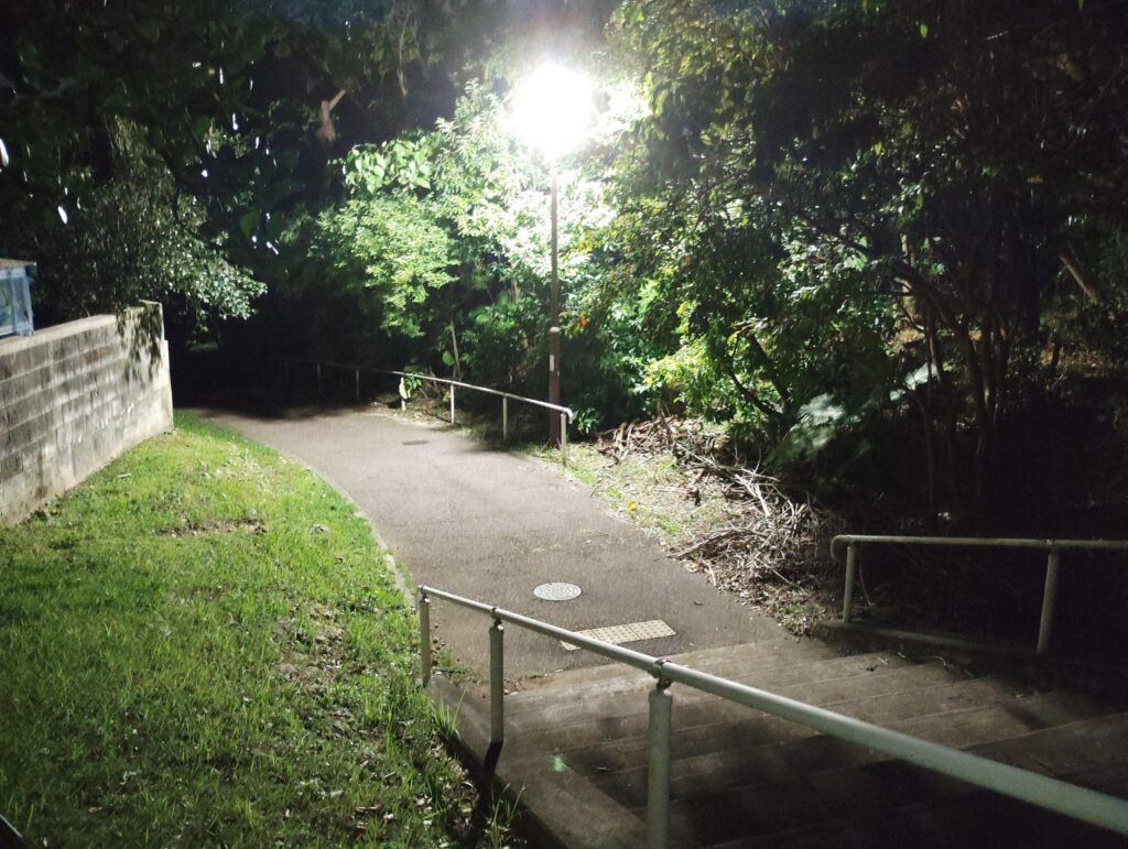 みんみんにつながる遊歩道の外灯も点灯しています。外灯の右側は小さな丘になっていて、みんみんができた頃にドングリ(アマミアラカシ)など在来の樹木を植栽したところです。沖縄県の亜熱帯緑化事例発表会で最優秀賞をいただきましたが、外灯が設置され樹木の枝が刈り取られています。子どもたちが自然をふれあえる空間にしたかったのに残念です。