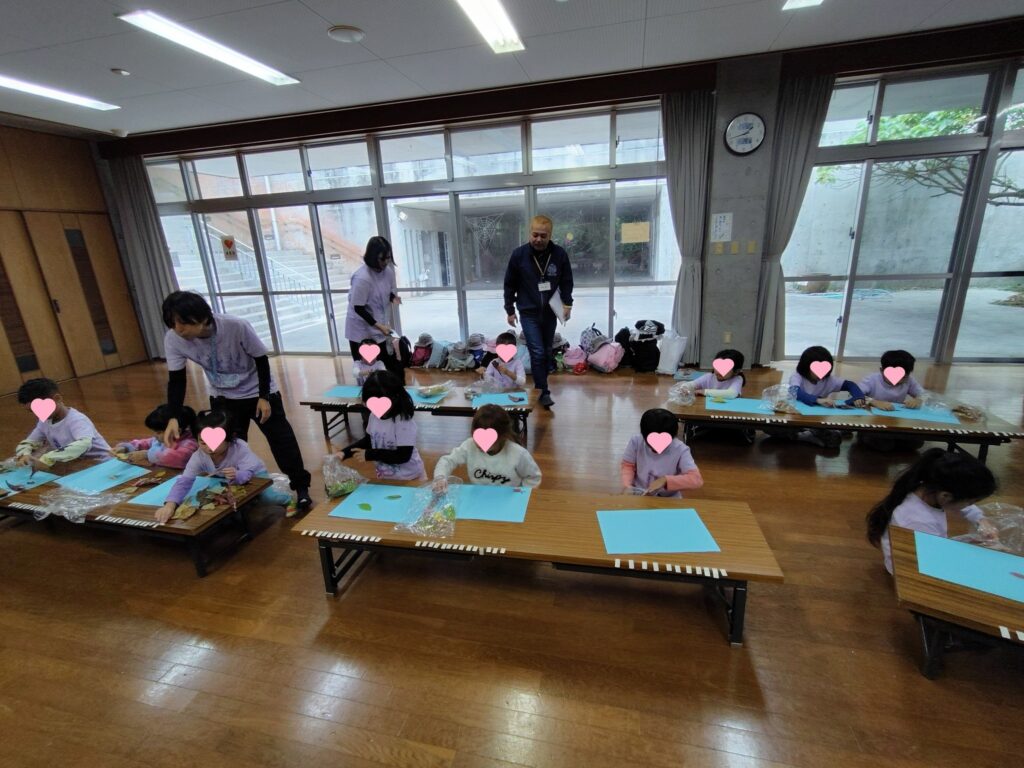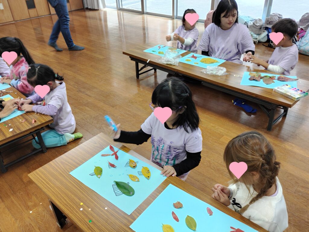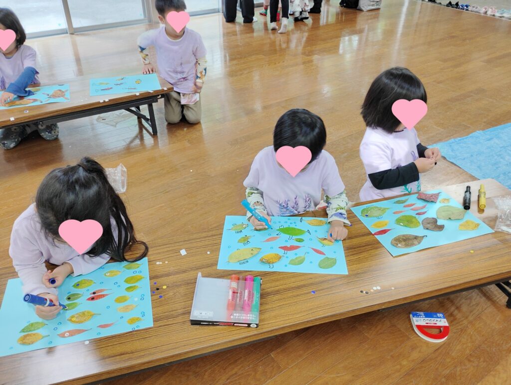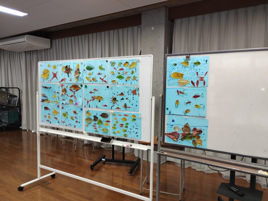 落ち葉で森の水族館は、いろんな形や色の落ち葉を青い画用紙に張り付けて水族館を作るみんみんのオリジナルプログラムです。あかるい子保育園の子どもたちにも気に入ってもらえたようです。