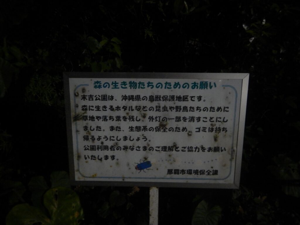 末吉公園は全域19haが那覇市の合意のもとに設定された県の特別鳥獣保護区です。那覇市も、末吉公園を自然環境を保全する重点区域に位置付けています。外灯は、ホタルだけでなく、様々な生き物の生息環境を損なうことが明らかになっています。設備を作ってしまったのだから、点灯するしかないという発想ではなく、もっと大きな視点で、将来に悔いを残さない解決策を検討してほしいです。
