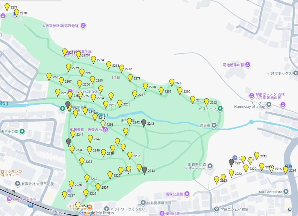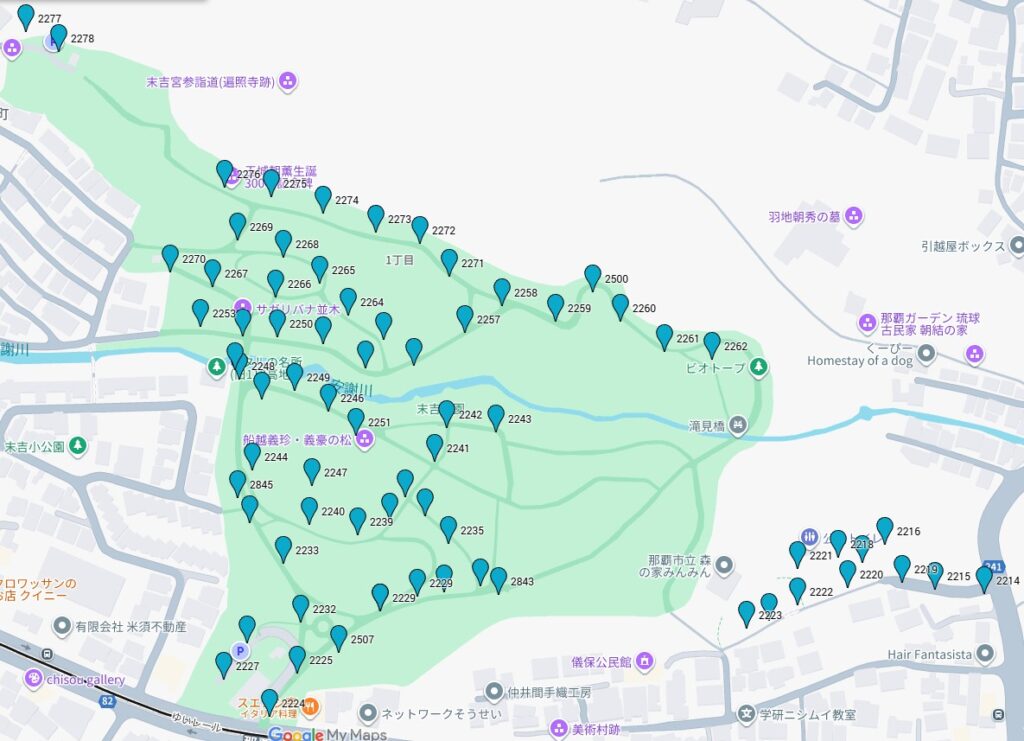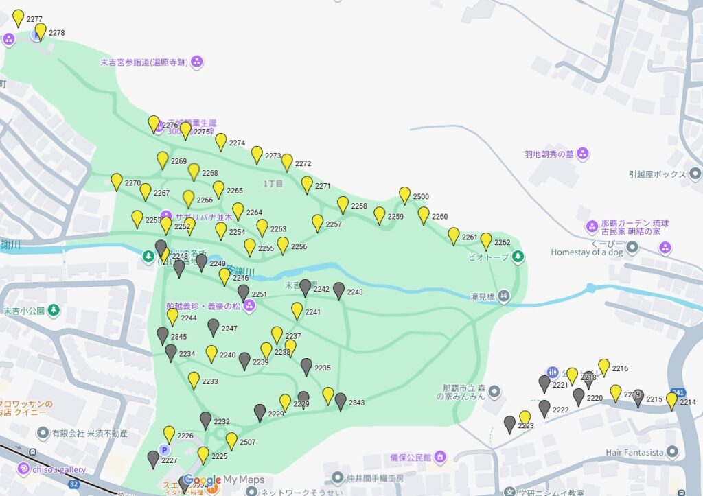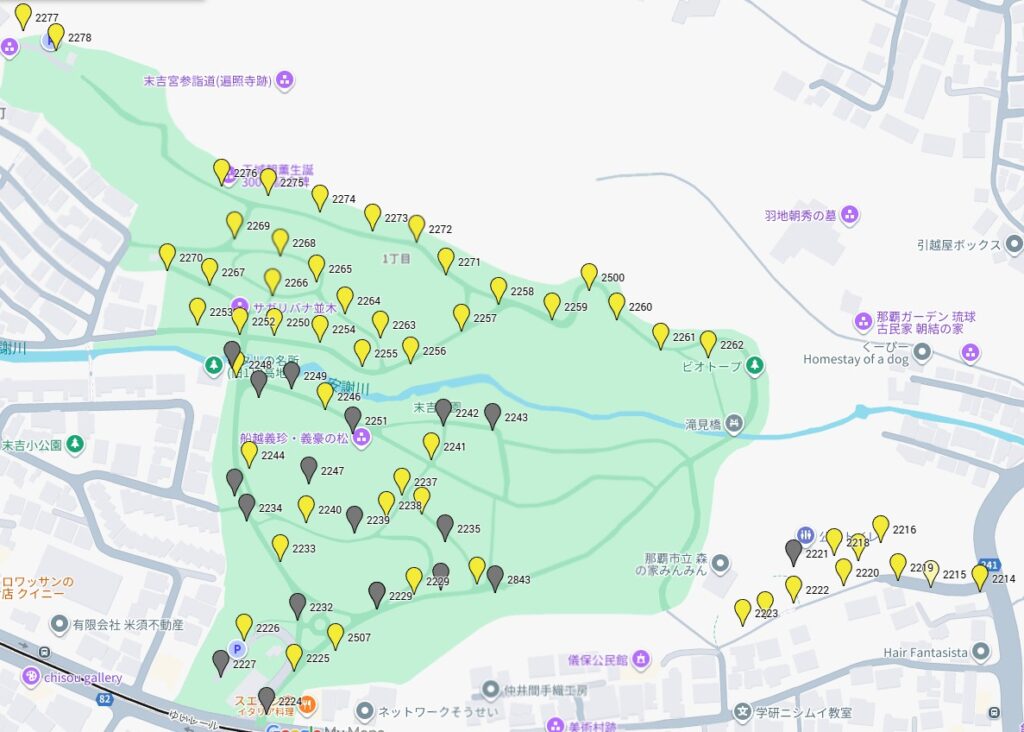 玉城朝薫の記念碑から滝見橋までの区間(外灯番号でいうと2276から2262の区間)は、生き物の保全のため外灯を消してほしいと環境保全課から要望を受けている場所だと思います。ホタルの繁殖ピークの4月から9月まで消灯するという調整が行われたのかもしれませんが、10月以降は外灯をつけても問題ないということではないはずです。この辺りの消灯時間を最も遅らせる理由もわかりません。