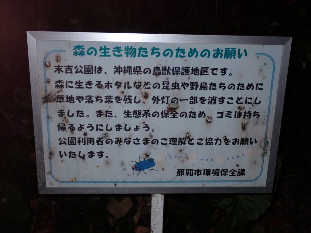 90年代の初めころまでは、公園の車の出入り口が21時に施錠されるのに合わせて、22時には外灯を消すようにしていたようです。ただ、それでは、暗さを必要とする生き物に影響があるのではないかということが問題となり、特にホタルの繁殖時期にあたる4月から9月については、北側奥(玉城朝薫の碑から滝見橋にかけて)の外灯を常時消灯することになりました(環境保全課と公園管理課の協議の結果なので公園内にそのことを説明した立看も残っています)。