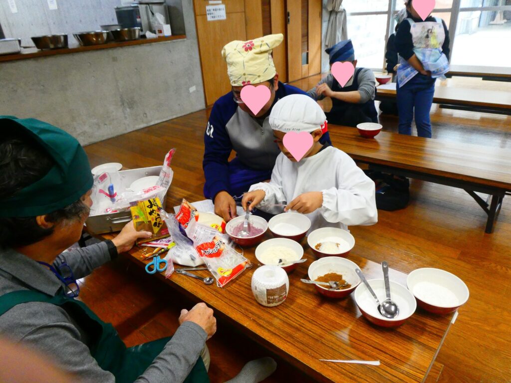 子どもたちが、もち米粉や砂糖、黒糖、紅いもパウダー、ジャガイモフレークを計量しました。