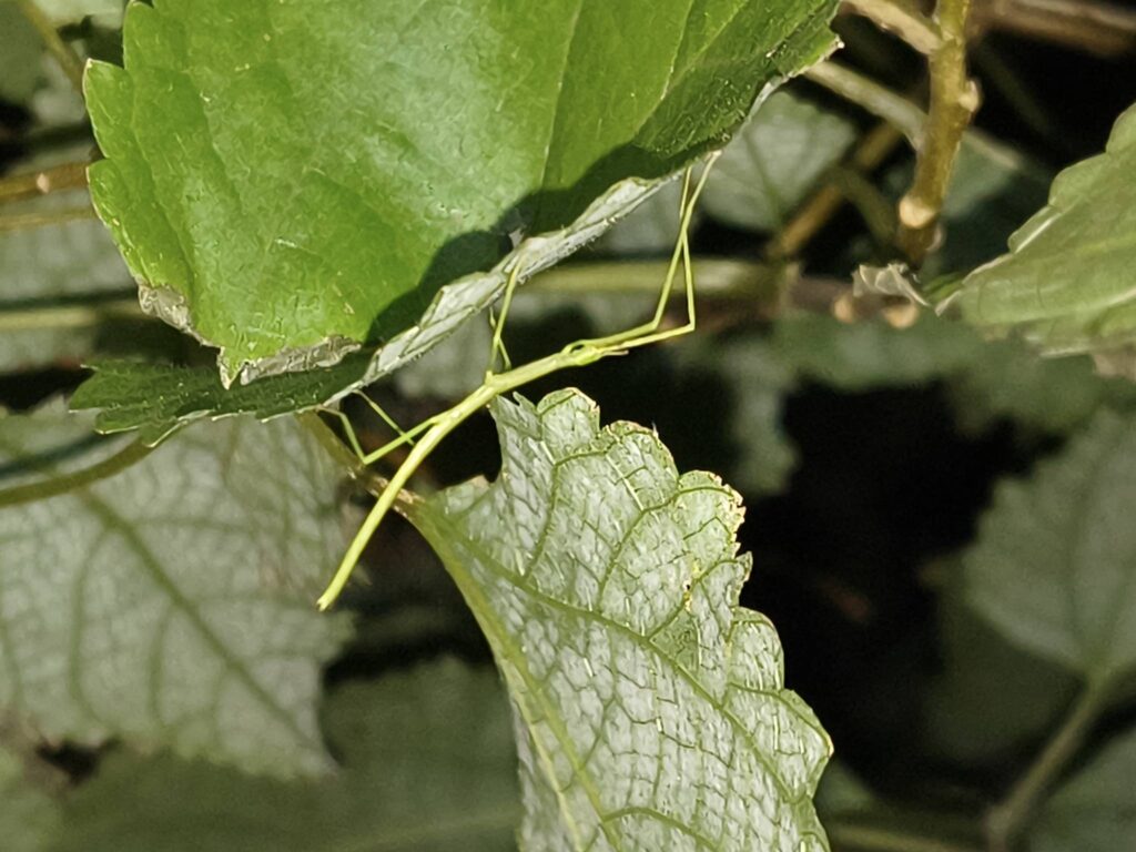 実は、今日、網を持った親子が「ナナフシはどこで採れますか?」と、みんみんを訪ねて来ました。事情を聞くと、学校でナナフシを採った(見つけた)友だちがいて、自分も採りたくなったそうです。「採ってどうするの?」と尋ねたら、「お家に持って帰って、一緒に遊んだら、元の所へ返してあげるんだよ。友だちも、そうしたって言ってたから。」という答えが帰ってきました。