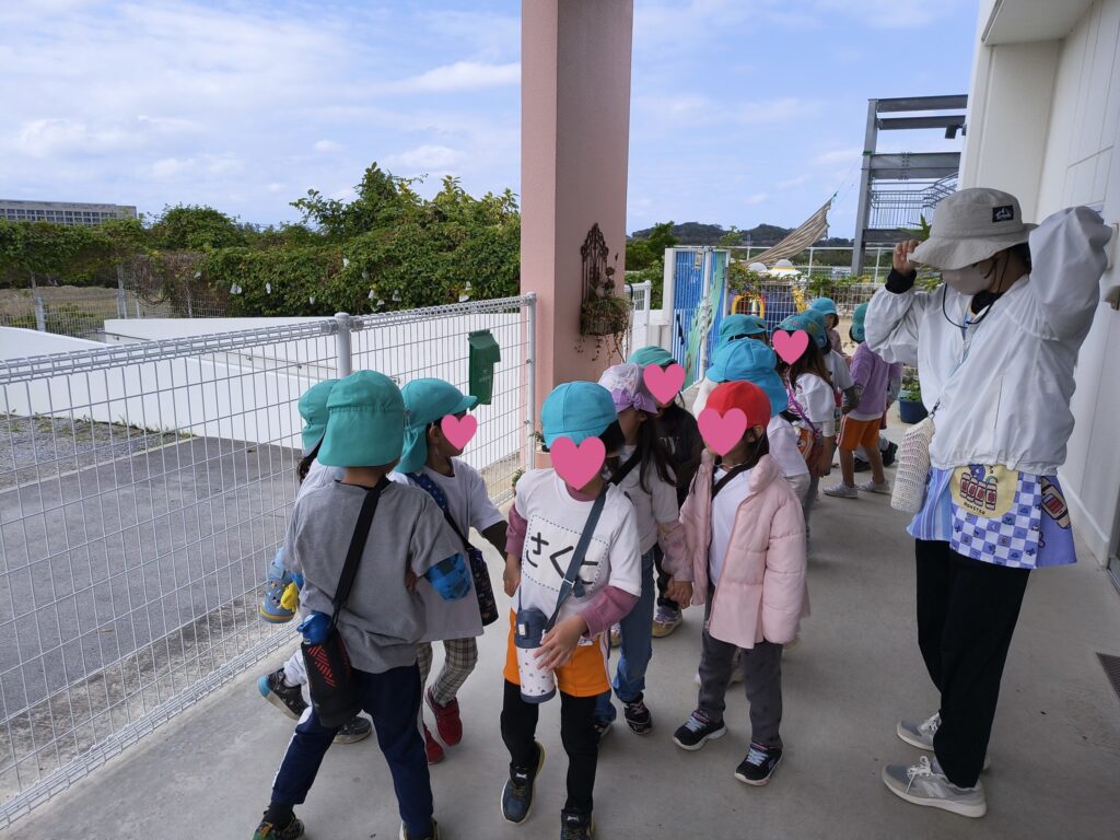 トイレを済ませて、帽子をかぶって、水筒を持ったら、仲良く手をつないで、種探しに出発です。