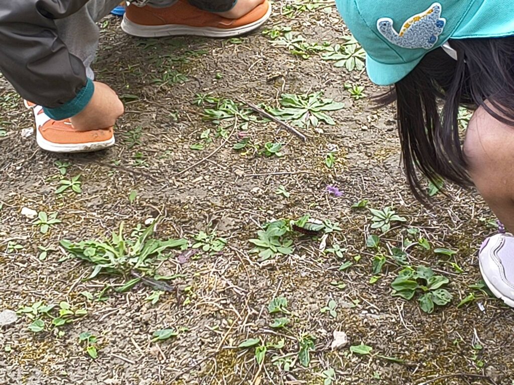 子どもたちは、ツマグロヒョウモンの幼虫のことを相変わらず「ぶつぶつけむし」と呼んだりしていますが、多くの子は平気で触れるようになっています。集めた幼虫に餌をを食べさせたり、保育園ごっこを始めたり、推しの幼虫を選んだりして、すぐに遊び始めました。ひとしきり遊んだ後、集めた幼虫をみんなで一匹づつリュウキュウコスミレの生えている場所に逃がしてから、園に戻りました。