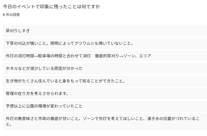新たに消灯を開始した場所(玉城朝薫の歌碑から滝見橋)に関しては、森の外の歩道沿いでは、「せっかく消灯しているのに、周りの樹木が少ないので、点灯している外灯からの光が強く漏れている。」や「せっかく消灯しているのに、周囲の草刈りがひどくてもったいない。」という意見が聞かれました。