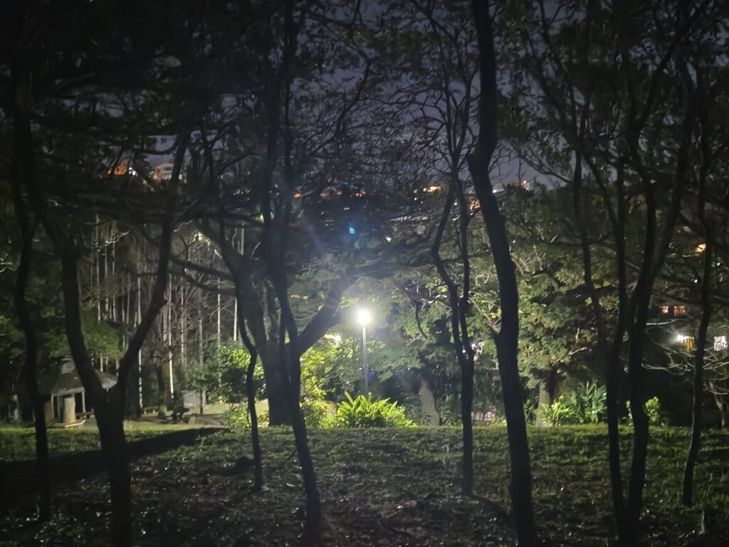 玉城朝薫の歌碑のあたりは、1月から生き物の生息に配慮した完全消灯が実施されています(4月から9月については以前から全消灯)。しかし、周囲の外灯の光は、この辺りまで漏れてきています(LEDになって照度が上がっていることとと樹木がスカスカに選定されていることによる影響?)。