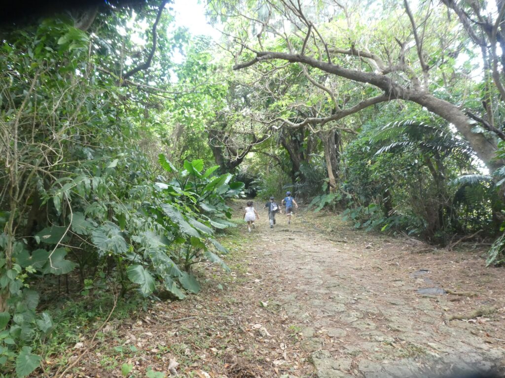 この日は、森を抜けて末吉宮に行って、石畳の道から戻る定番のコースにしました。途中、頭上にオオコウモリがいたり、2種類のキンカメムシを見つけたり、ノカラムシの葉をワッペンにしたり、ノビルをかじってみたりしながら楽しく歩くことができました。