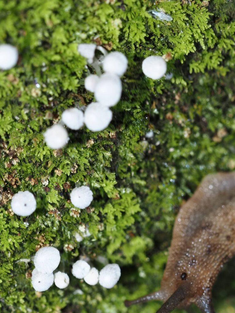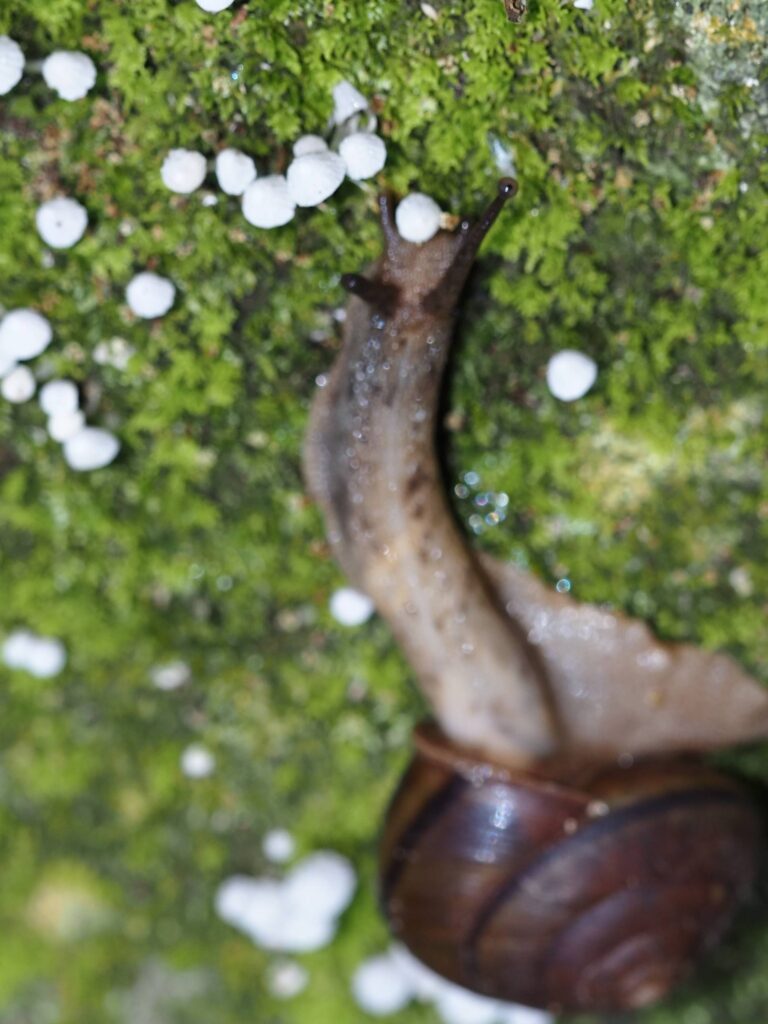 シュリマイマイの周りに白いつぶつぶが見えたので産卵?と一瞬思ってしまいました。白いのはキノコで、食事中のようでした。