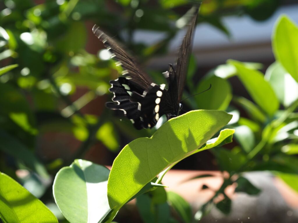 シロオビアゲハがシークワーサーの周りをパタパタ飛び回っていました。一瞬、枝先に止まりそうになったので、カメラを向けたのですが、すぐに飛び去っていきました。